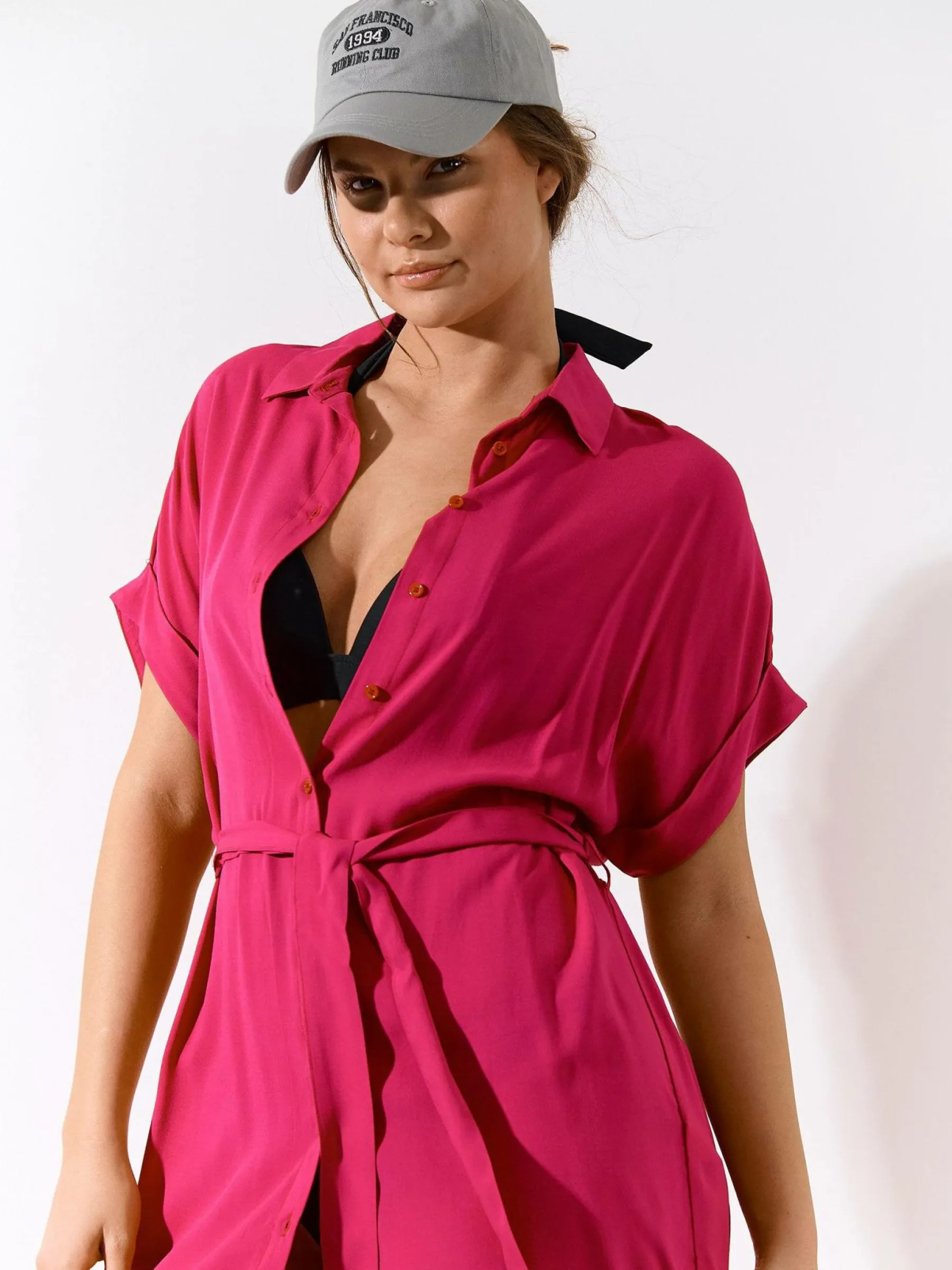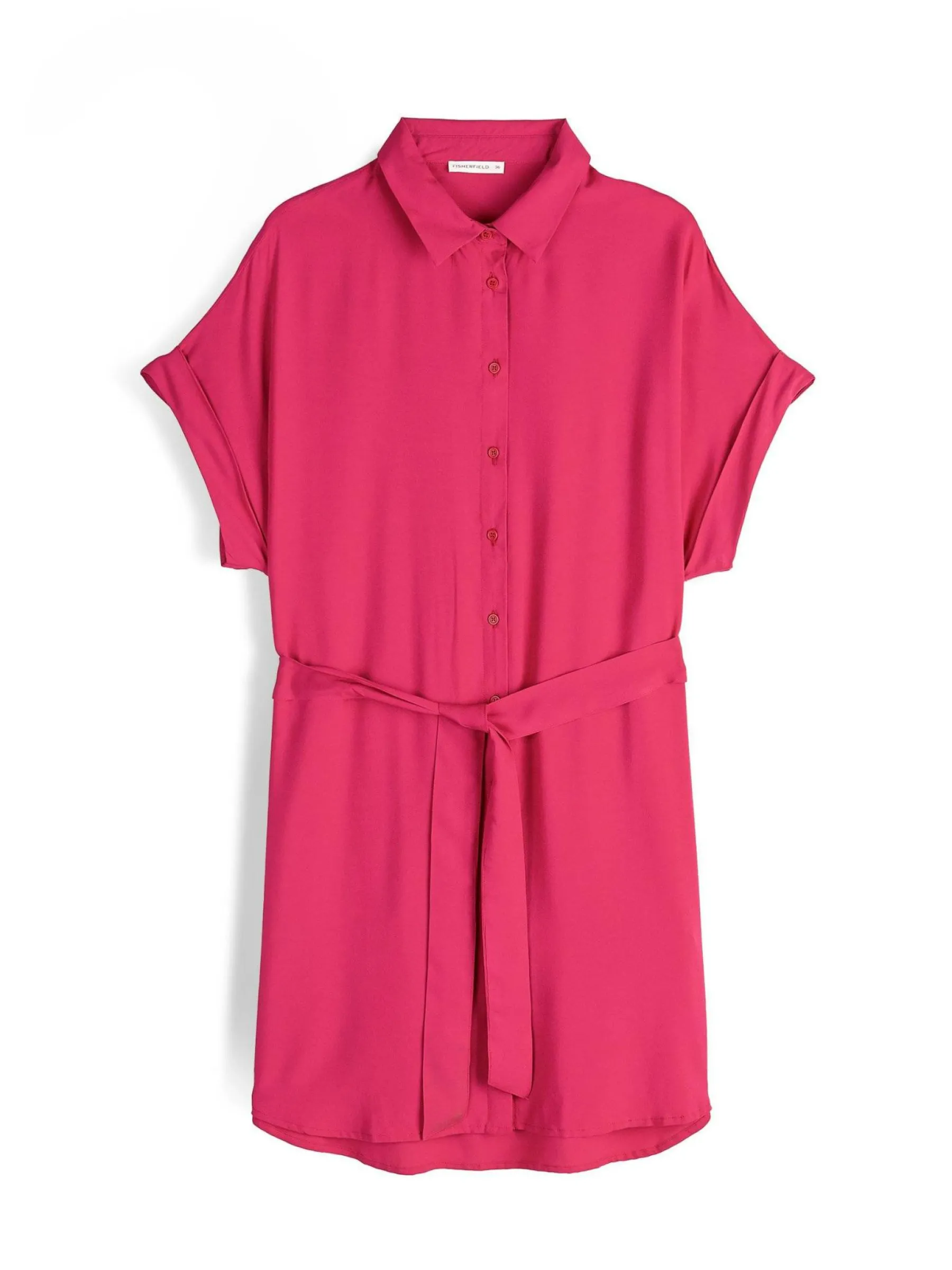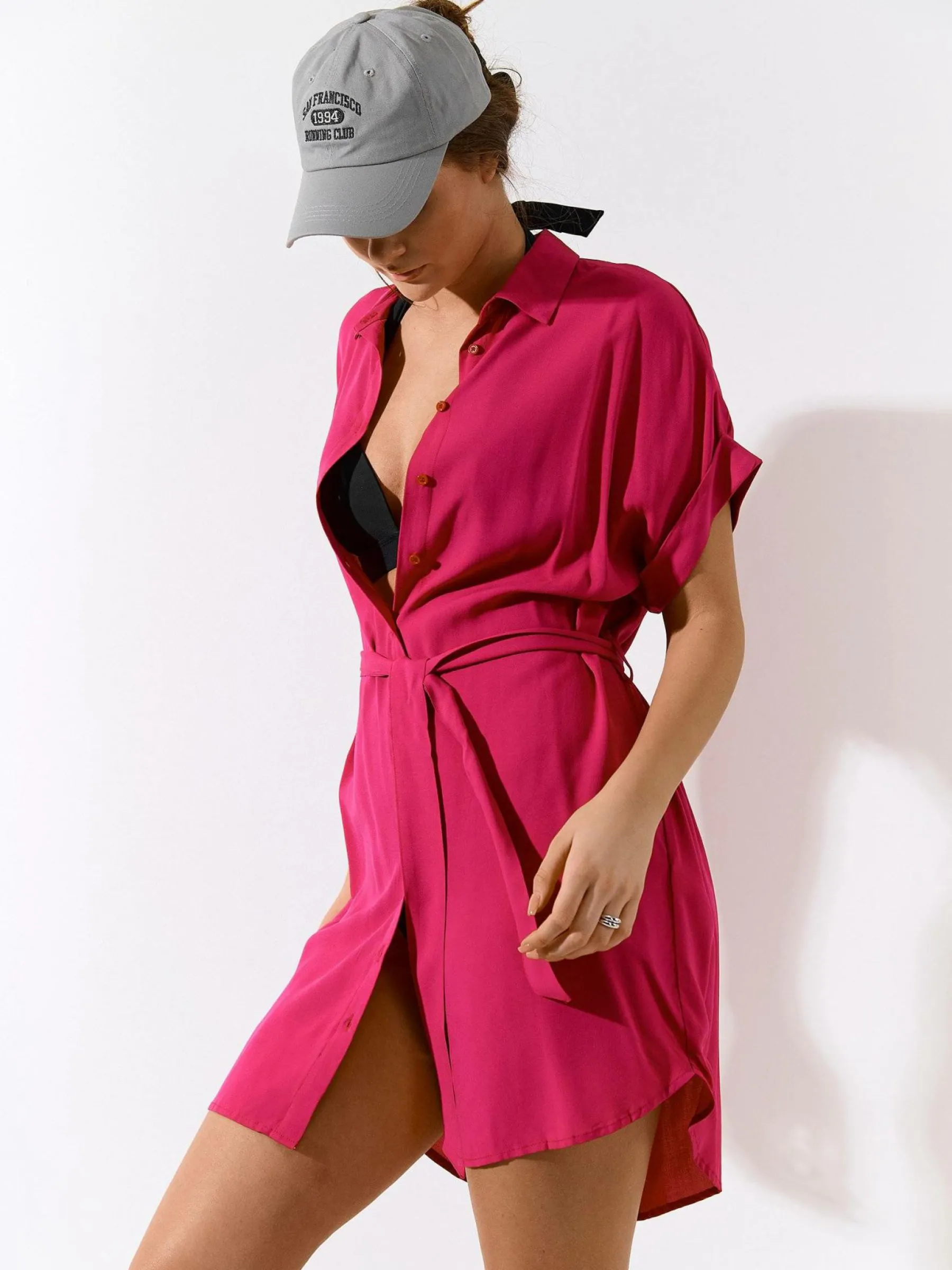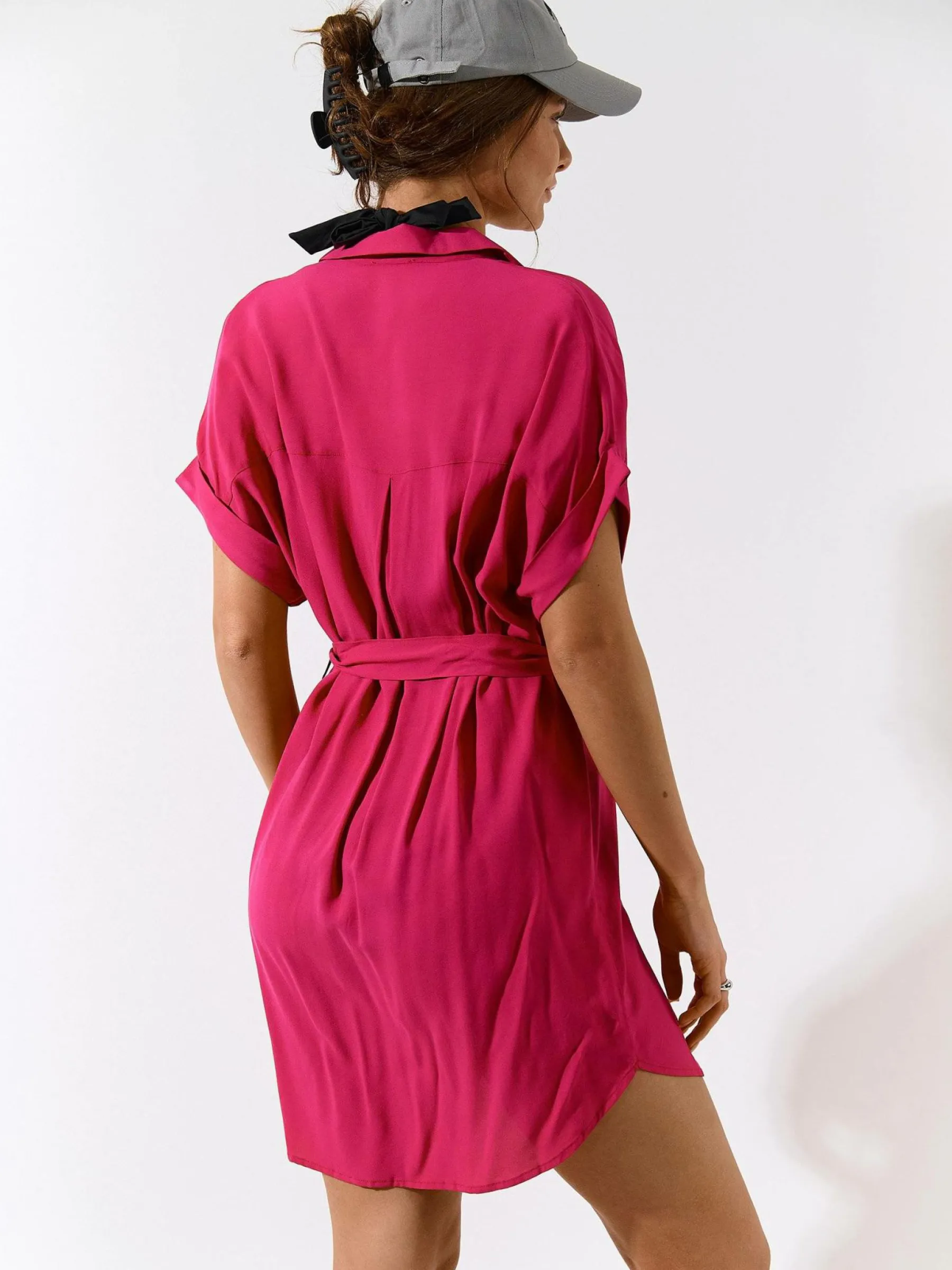 Kolor: różowyKrój: koszuloweTyp: sukienkaRekaw: krótki rękawDługość: miniPattern style: pojedynczy kolorDetal: n…