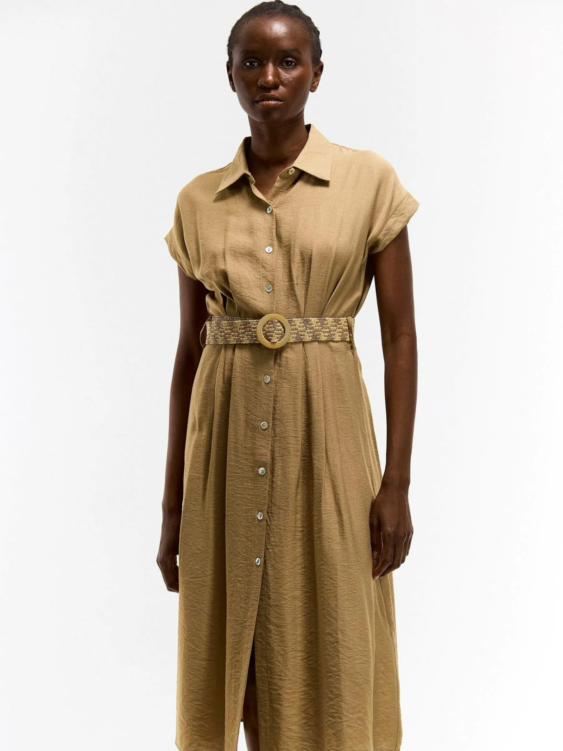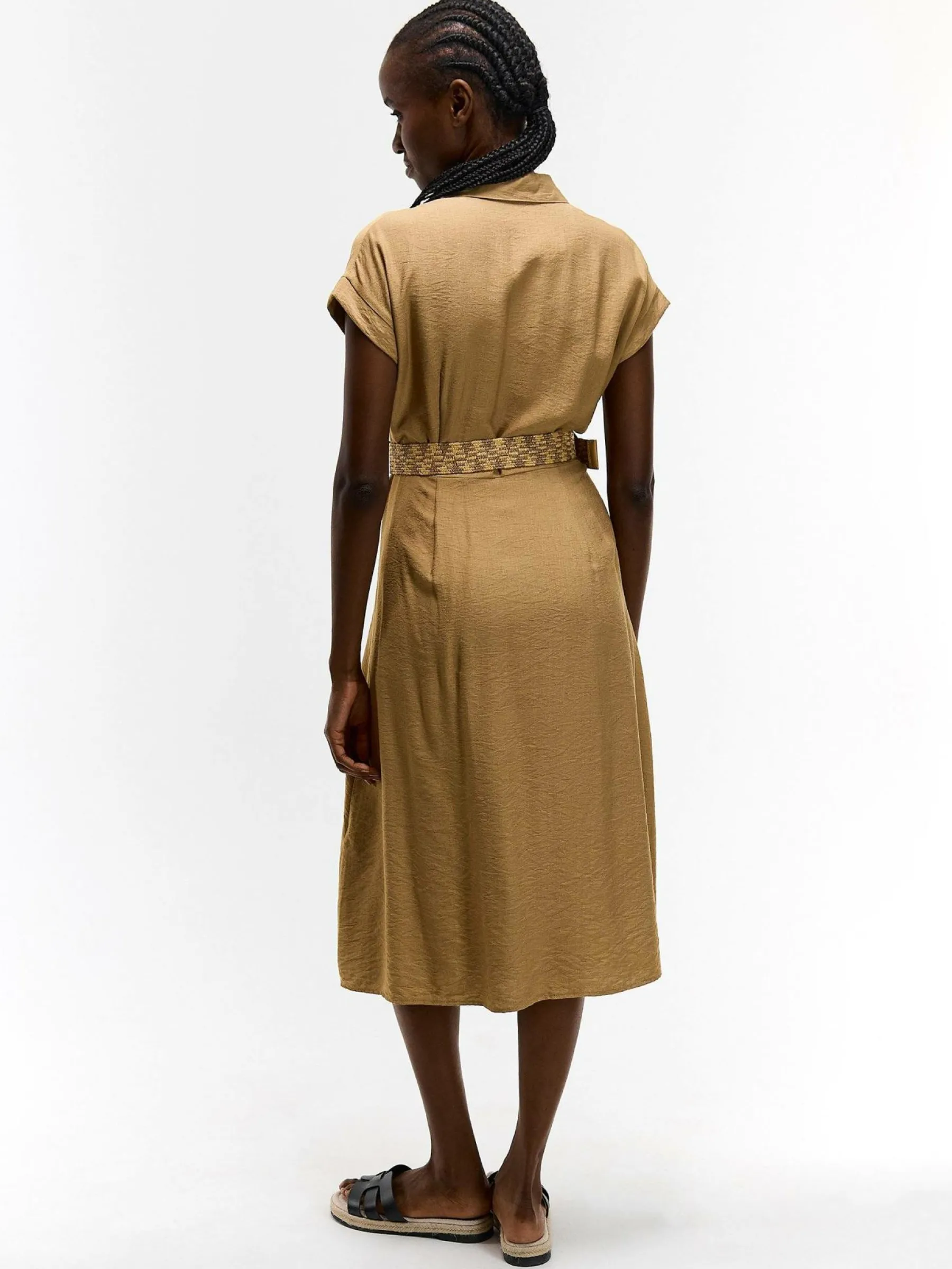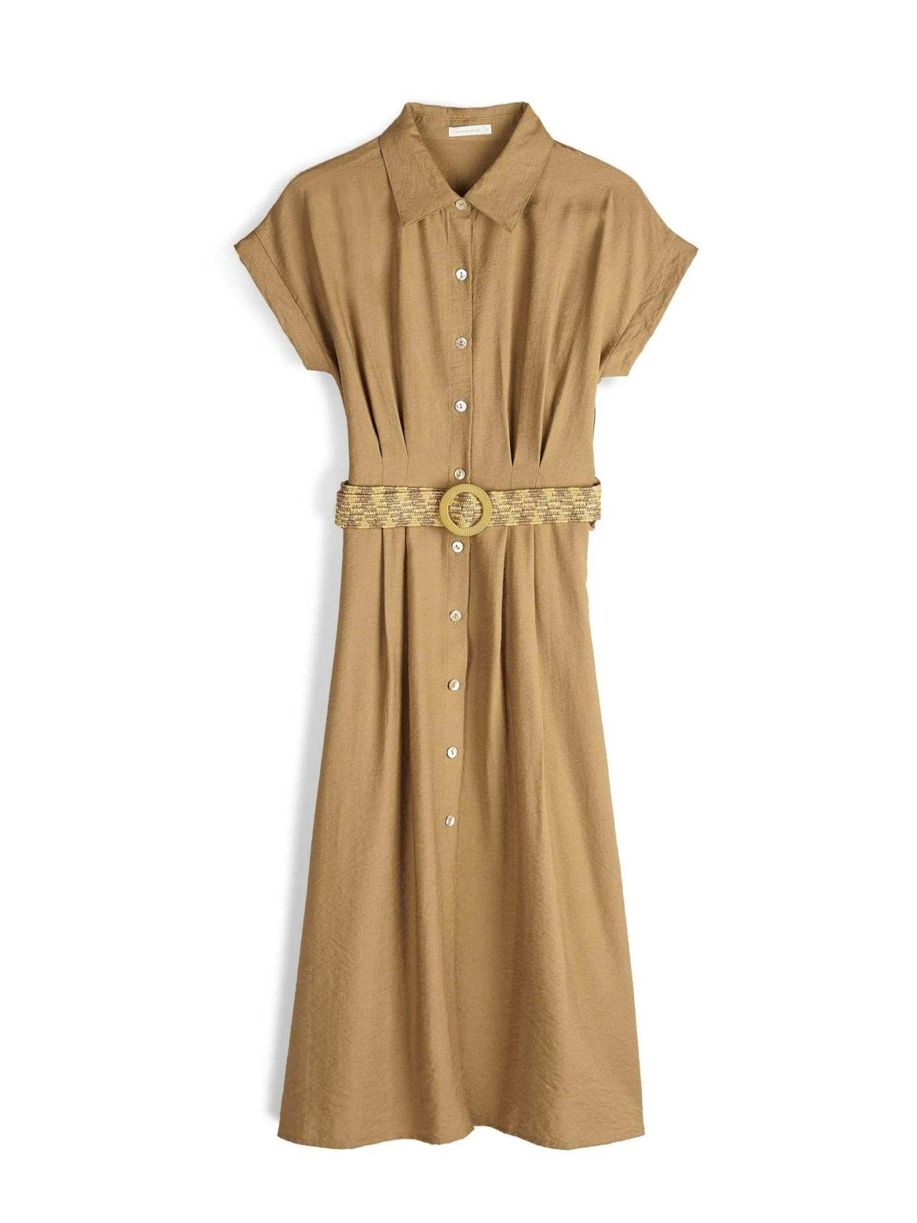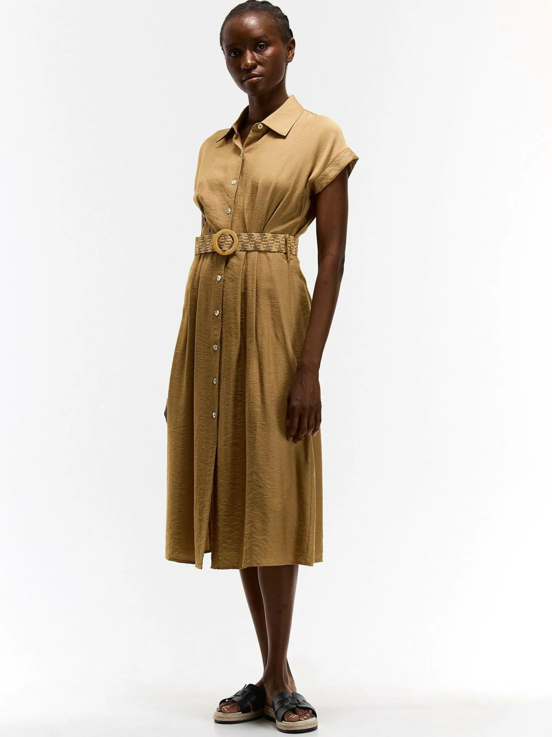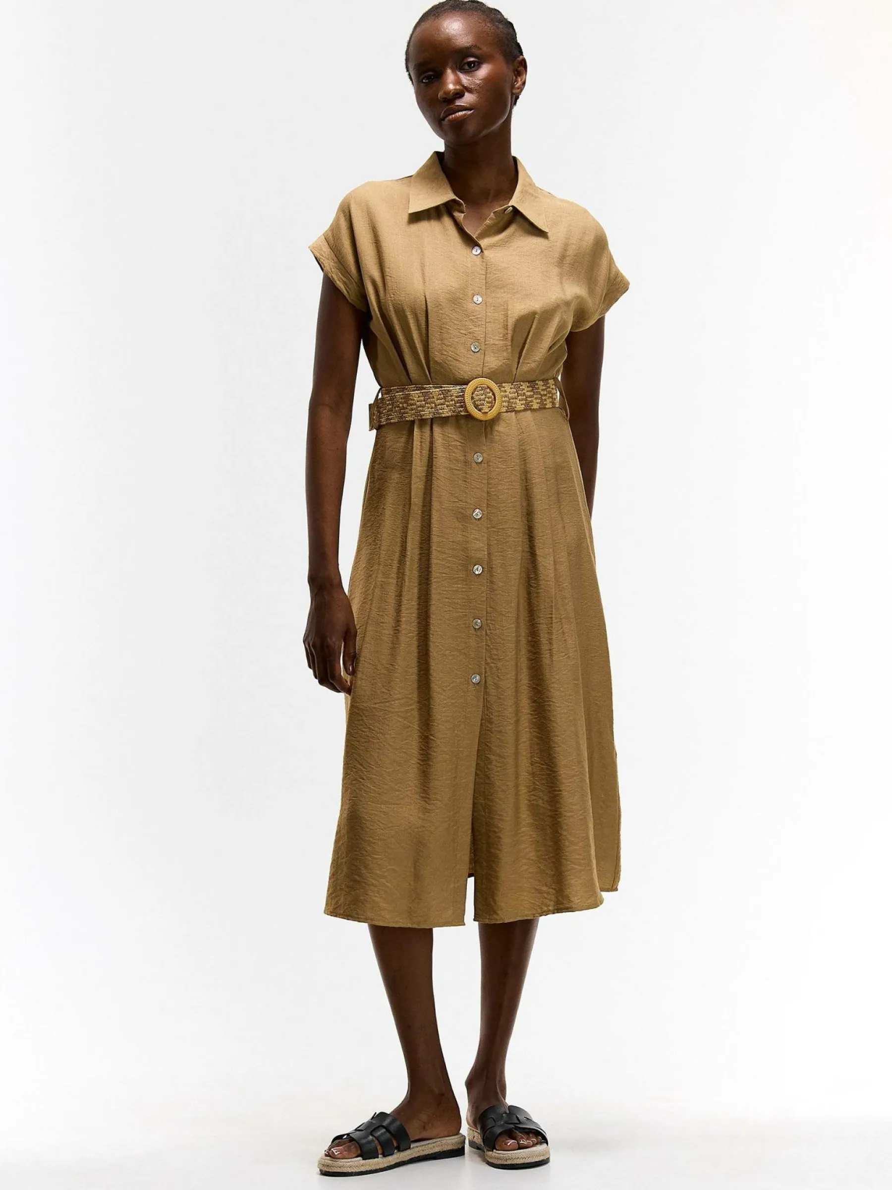 Kolor: brązowyKrój: koszulowe, asyTyp: sukienkaRekaw: krótki rękawDługość: midiPattern style: pojedynczy kolorDet…