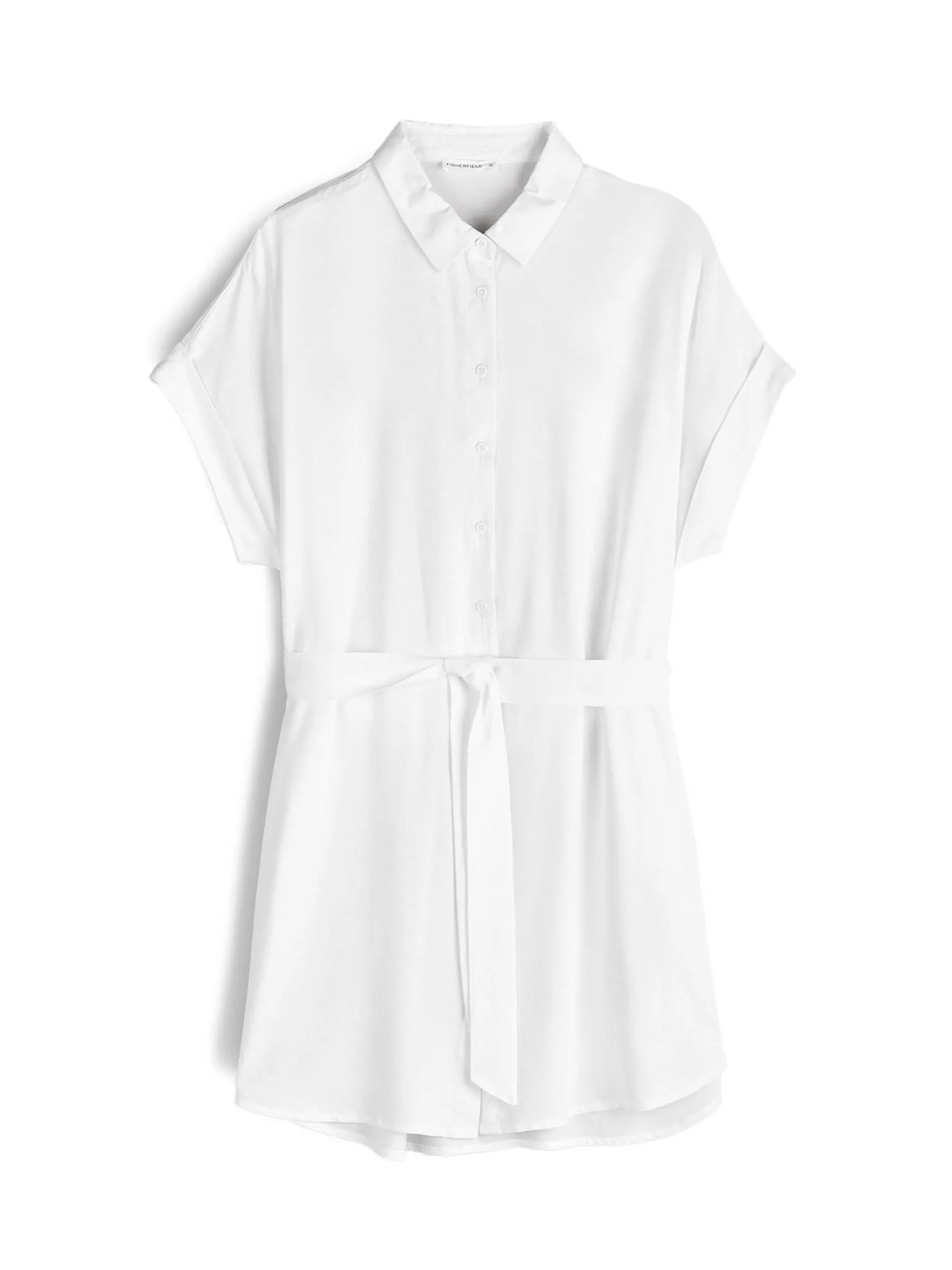 Kolor: białyKrój: koszuloweTyp: sukienkaRekaw: krótki rękawDługość: miniPattern style: pojedynczy kolorDetal: na …