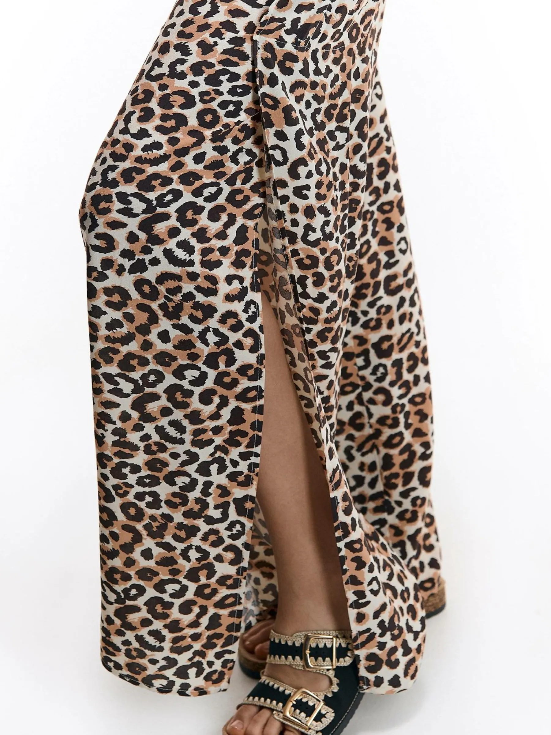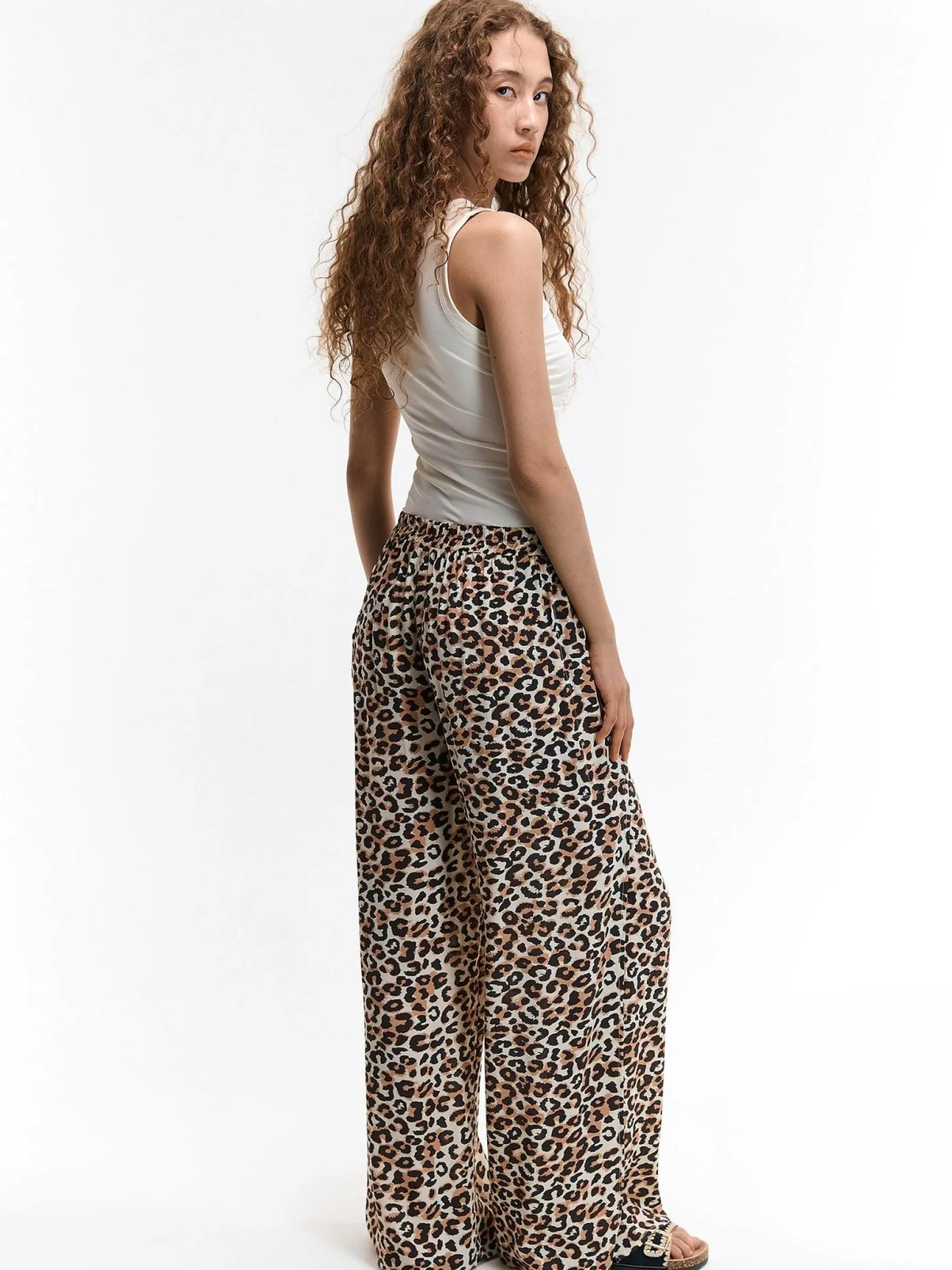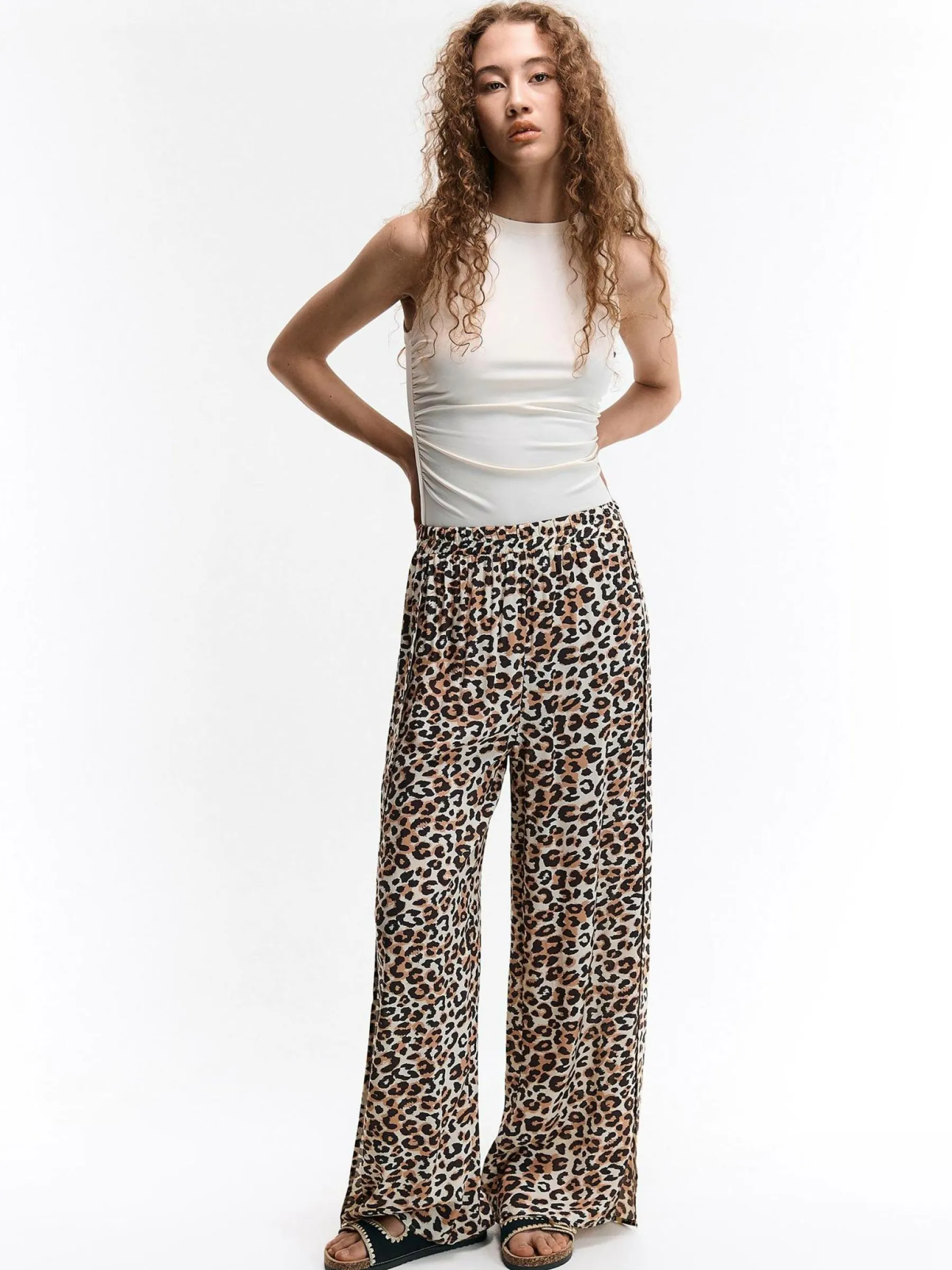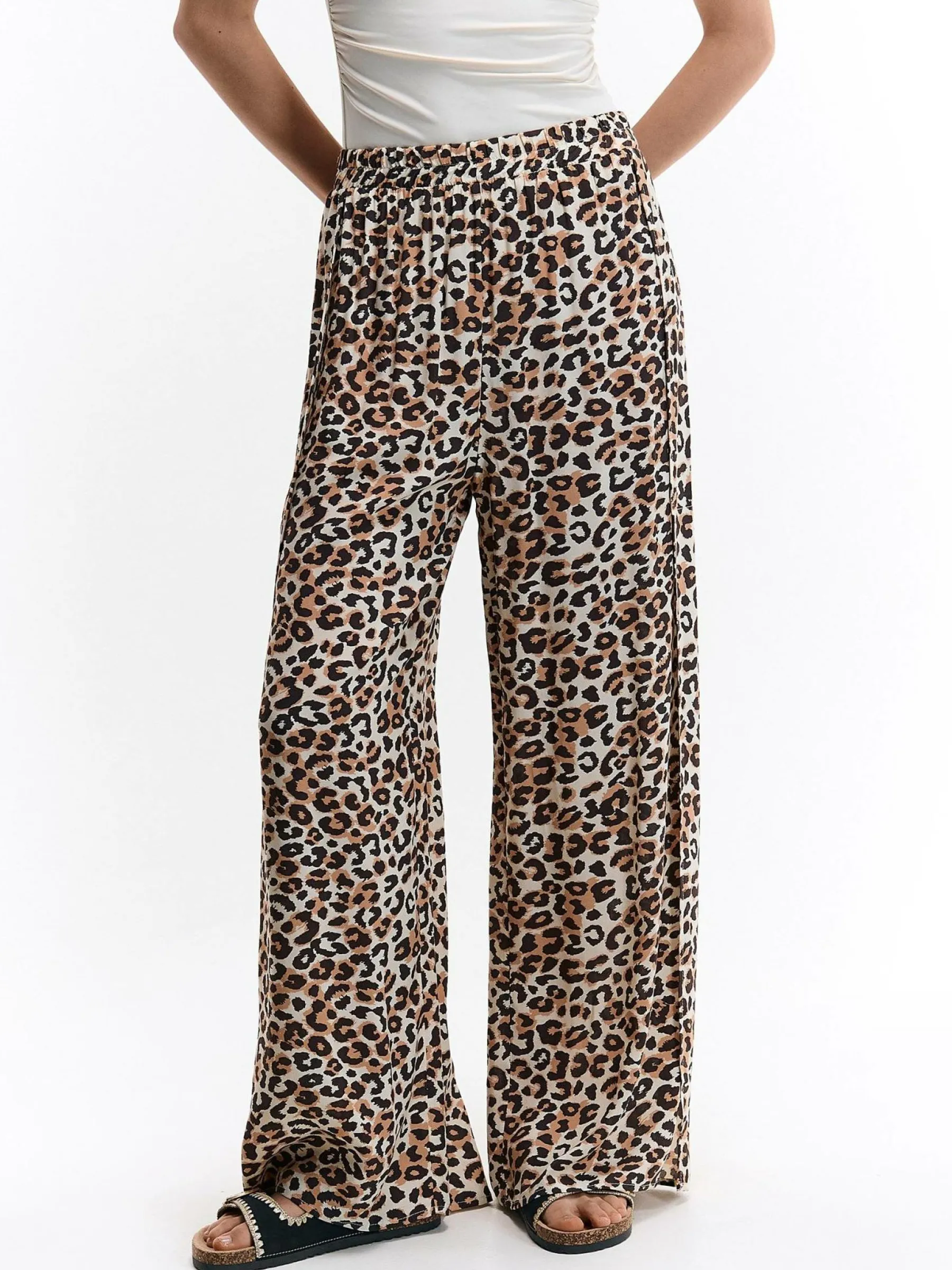 Kolor: beżowyKrój: szerokieTyp: spodnieDługość: dlugiePattern style: zwierzecyDetal: z elastyczną opaską, z rozci…
