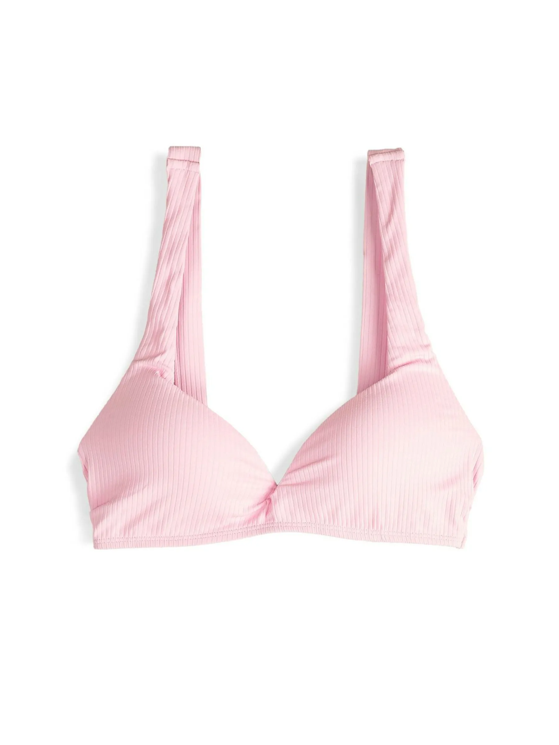 Kolor: różowyKrój: bikiniTyp: góra od bikiniPattern style: pojedynczy kolor, żebrowanyDetal: z ramiączkami, wzmocn…