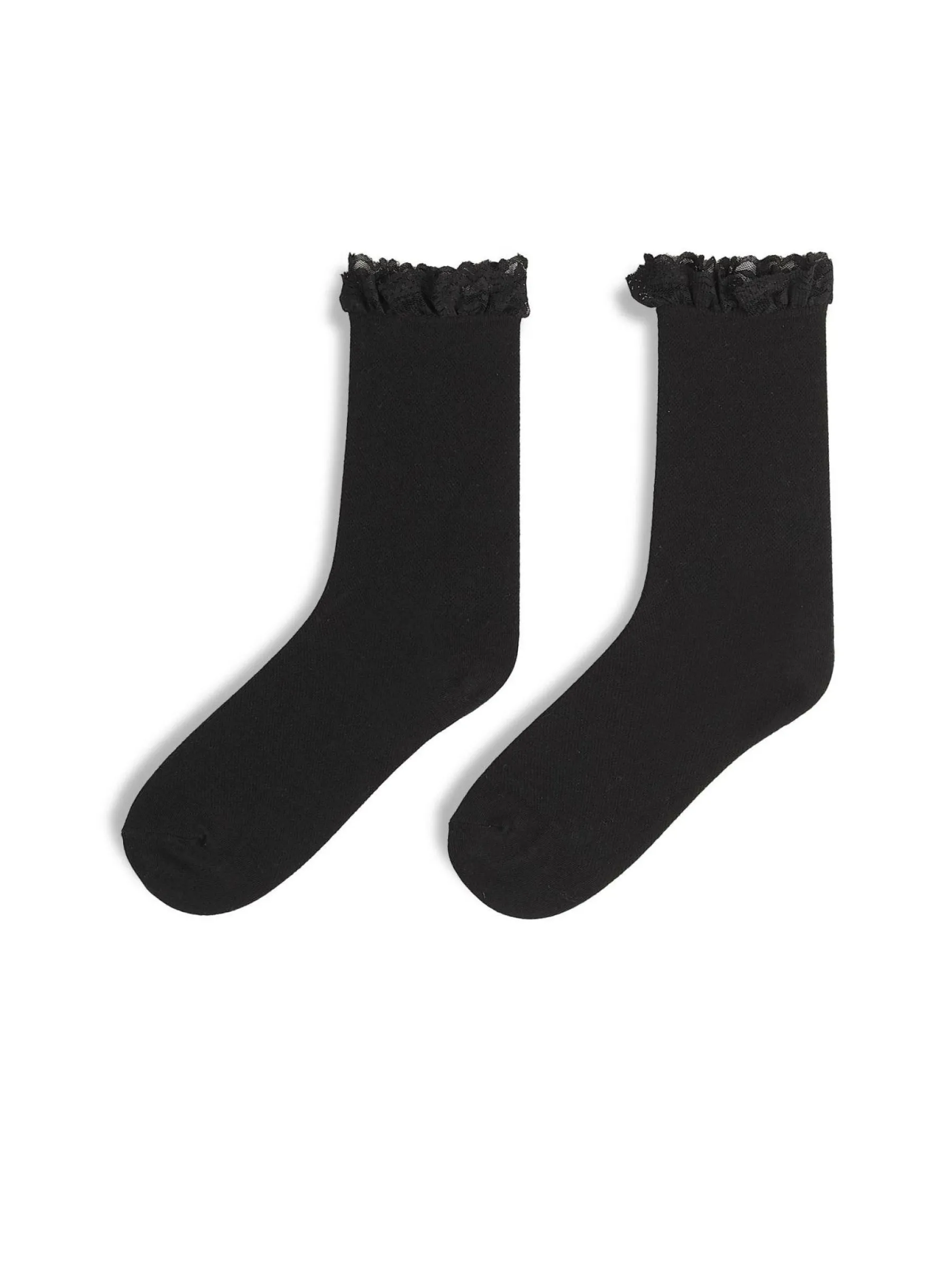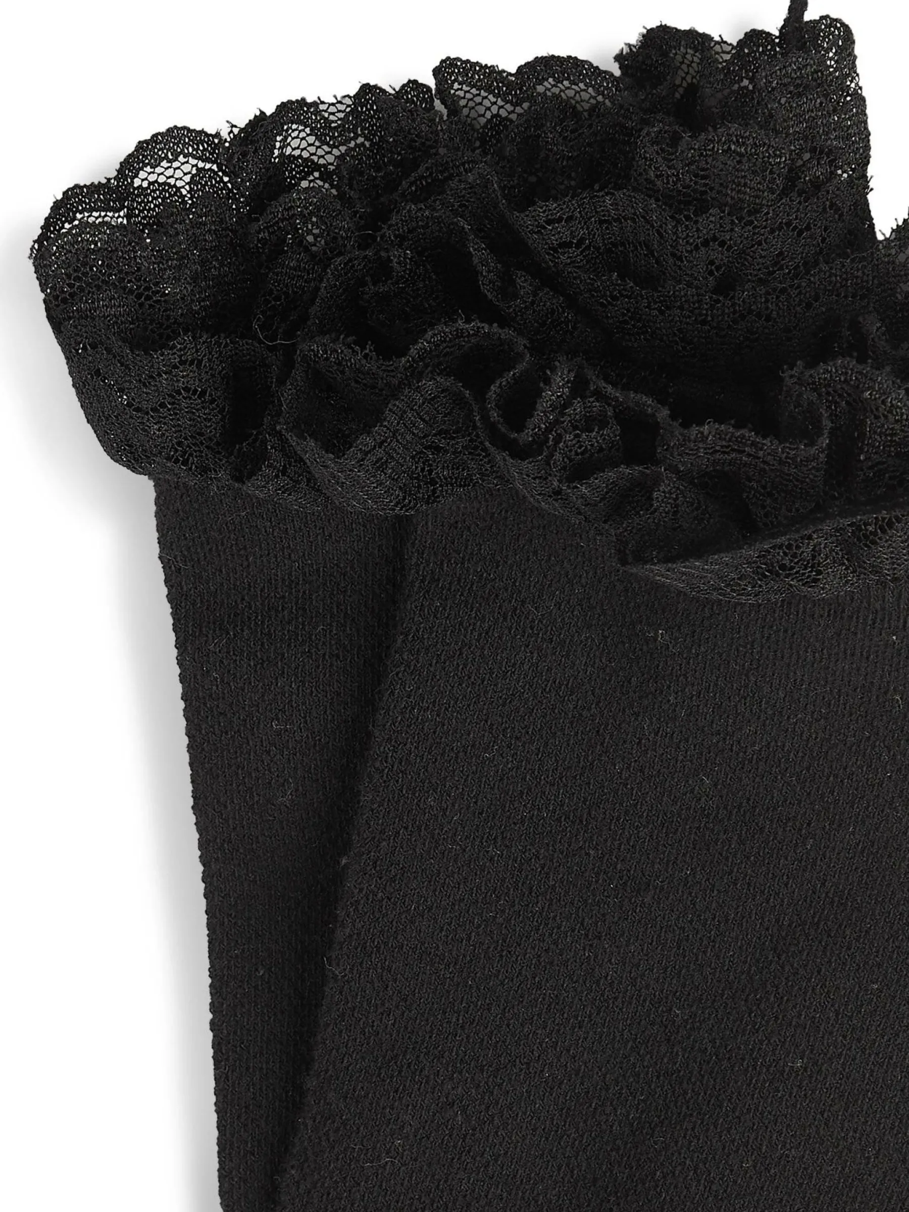 Kolor: czarnyKrój: wysokie skarpetyTyp: skarpetyPattern style: pojedynczy kolorDetal: z koronkąMateriał: mieszanyPłe…