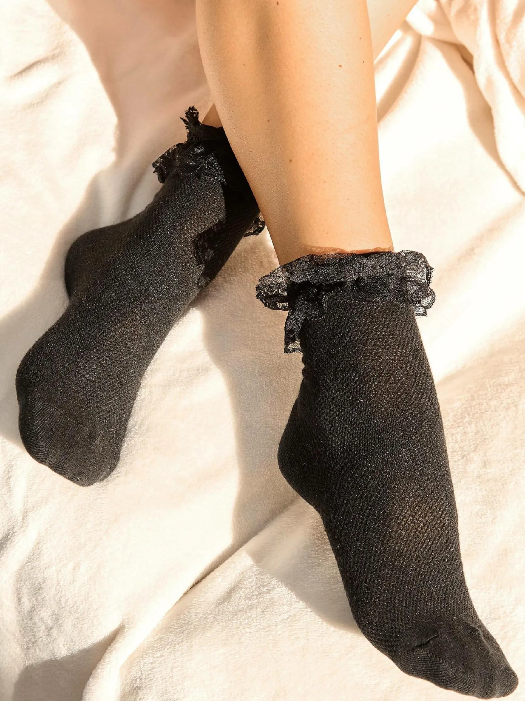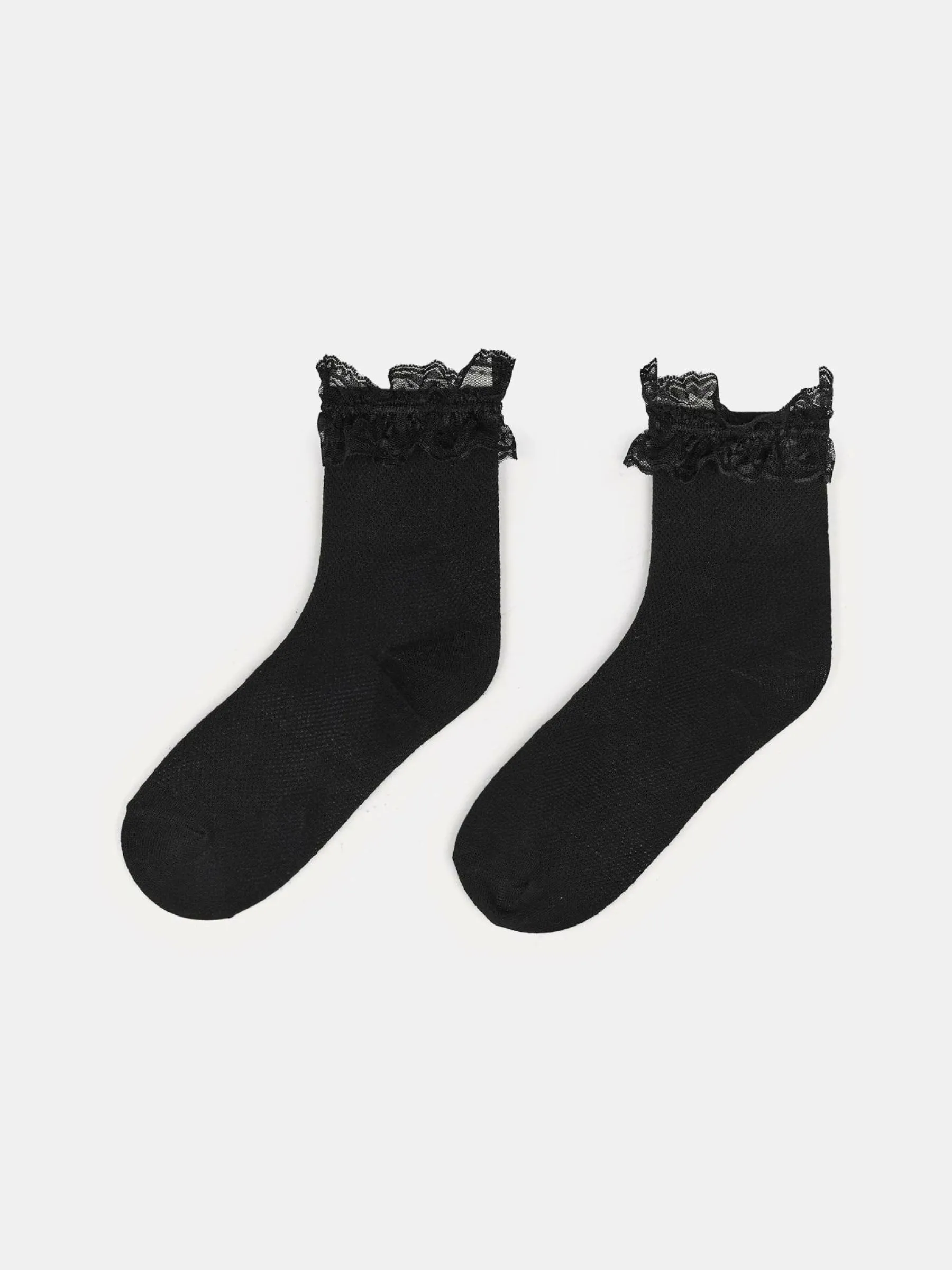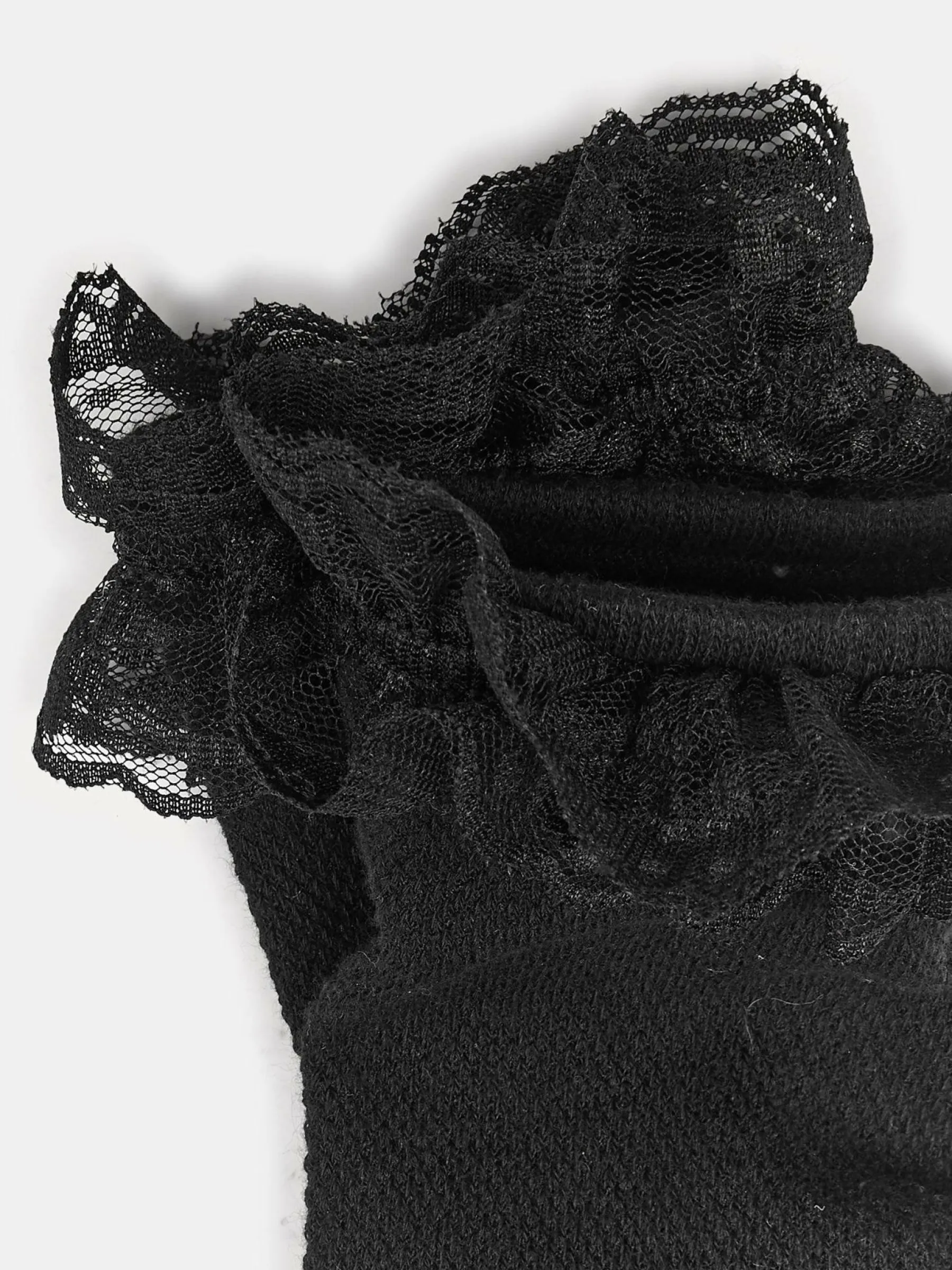 Kolor: czarnyKrój: wysokie skarpetyTyp: skarpetyPattern style: pojedynczy kolorDetal: z koronkąMateriał: mieszanyPłe…