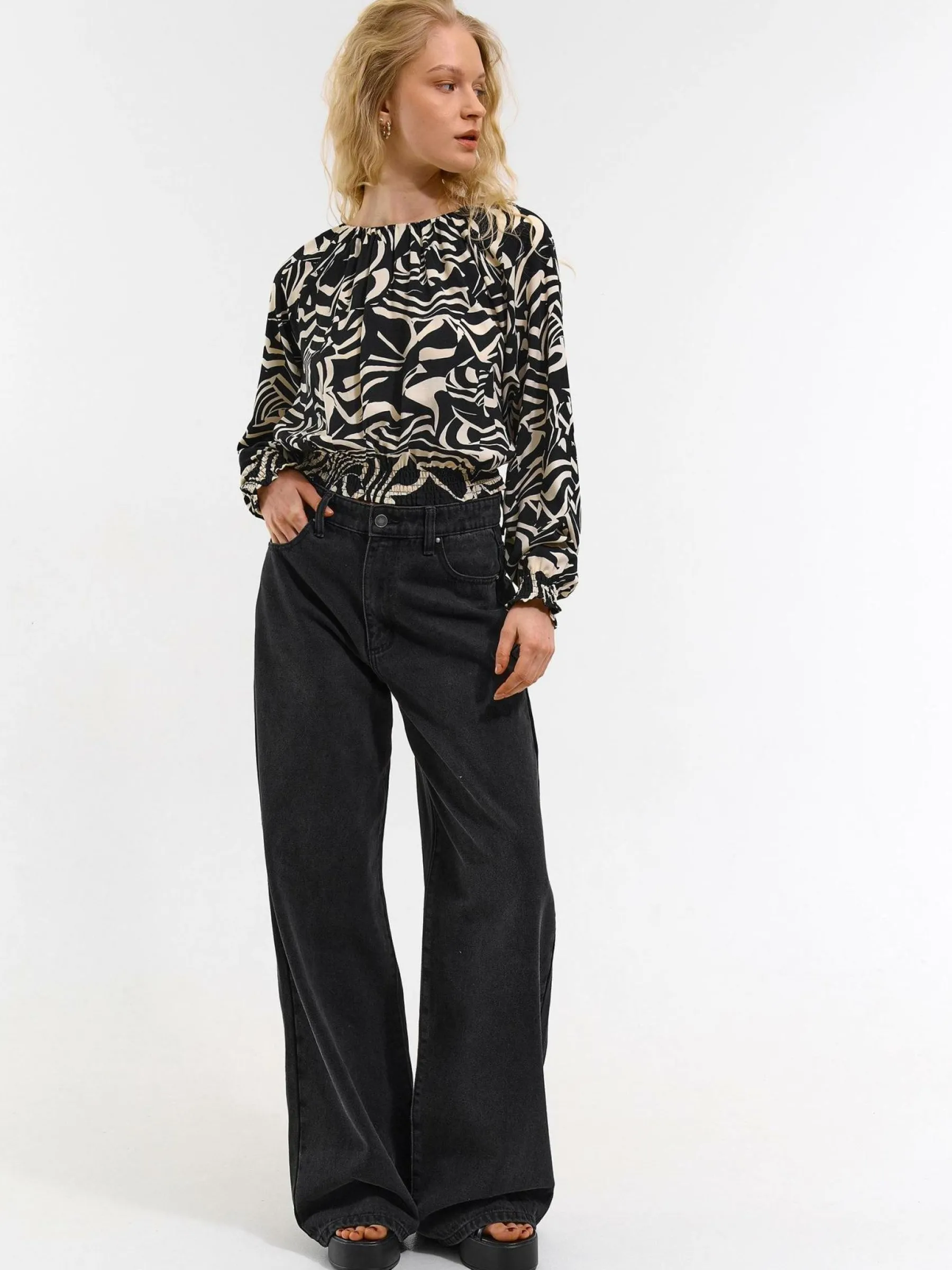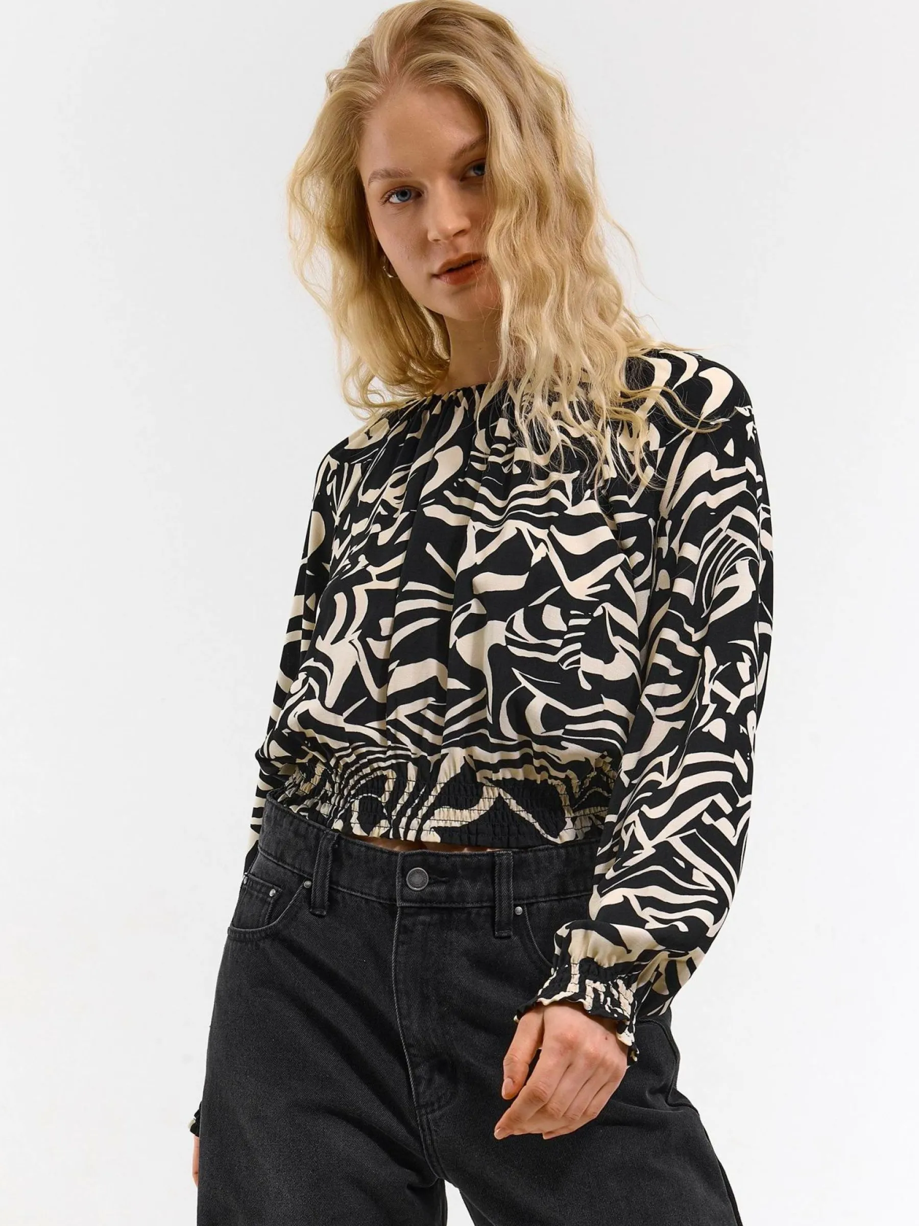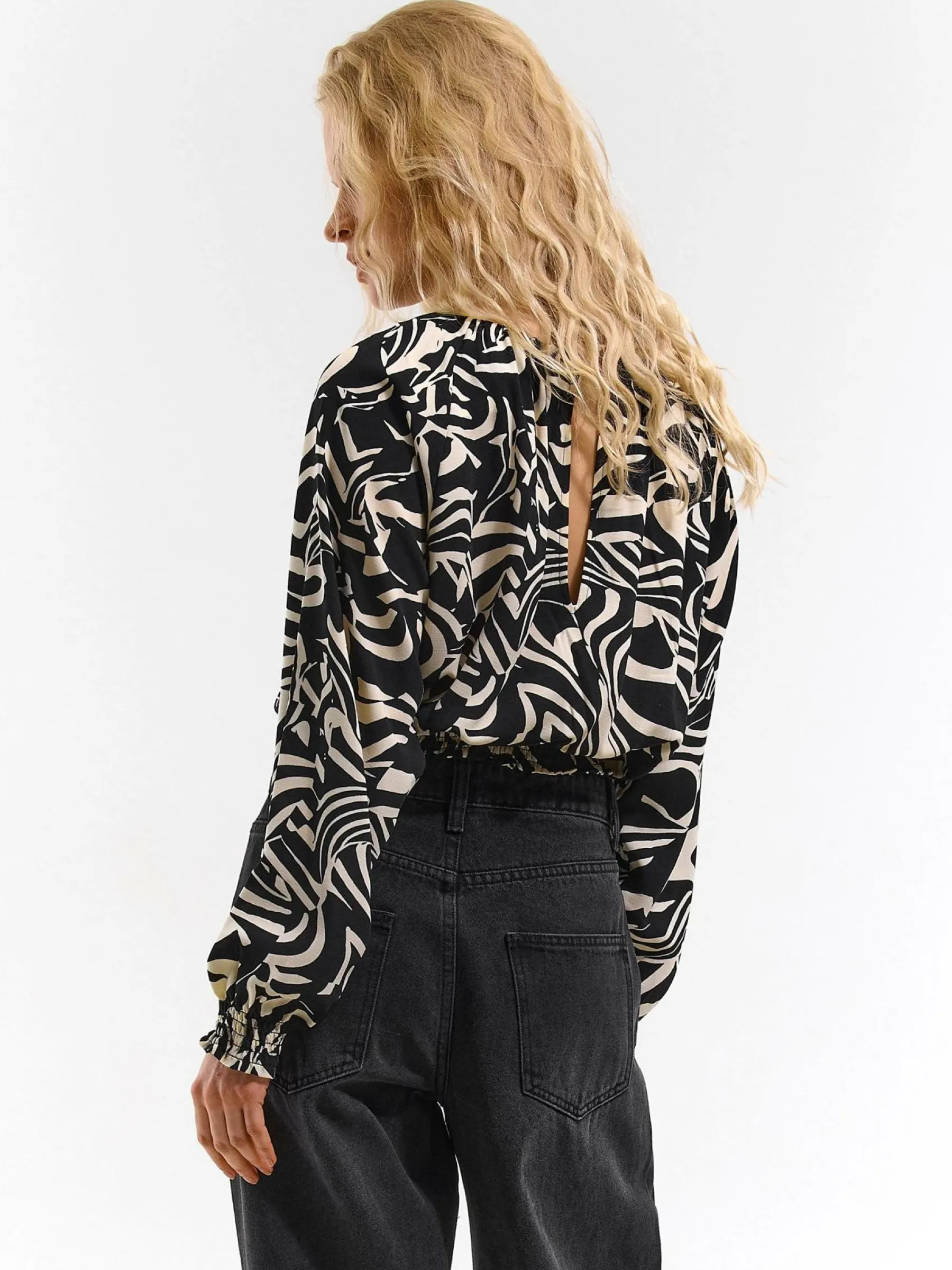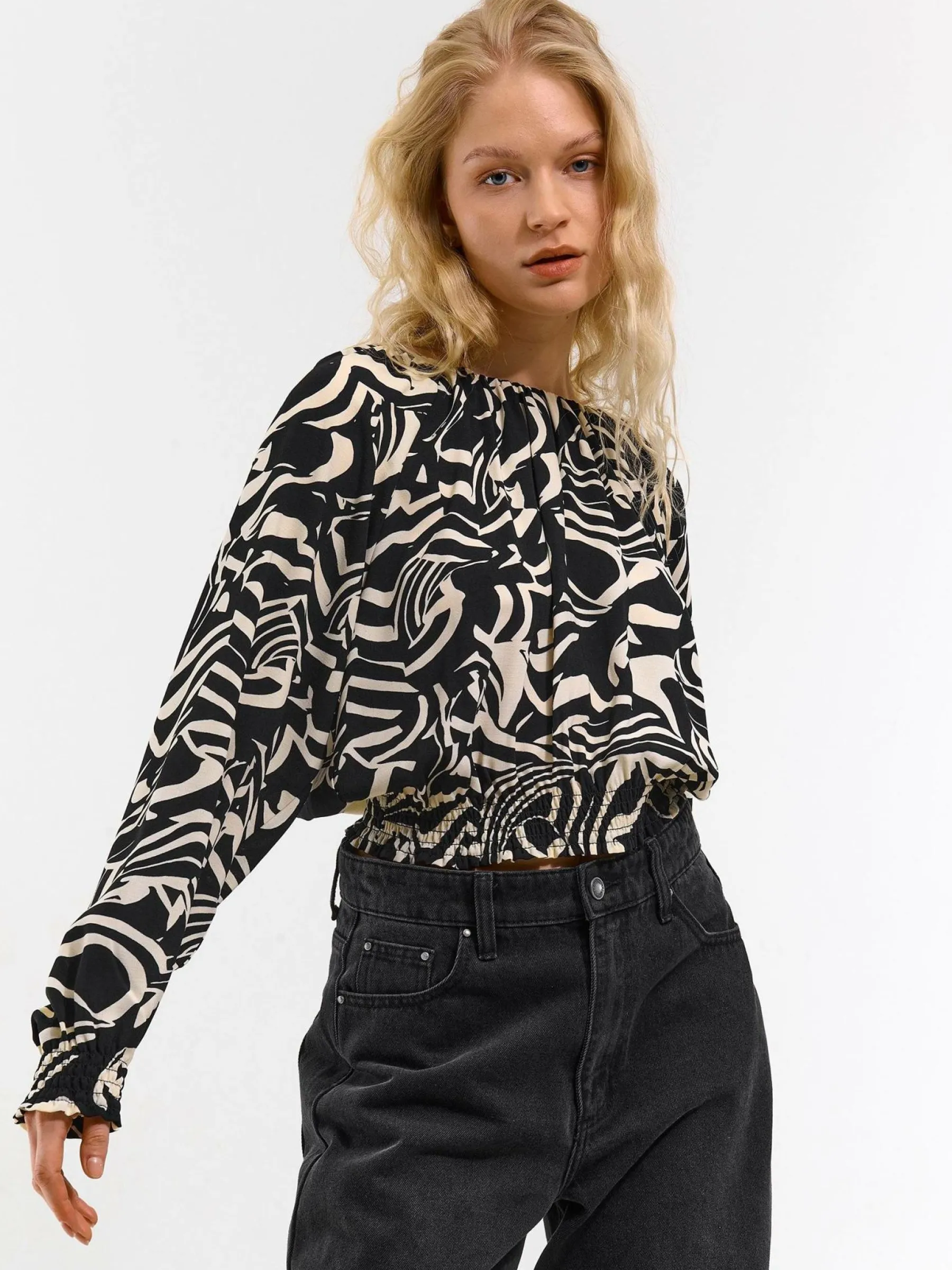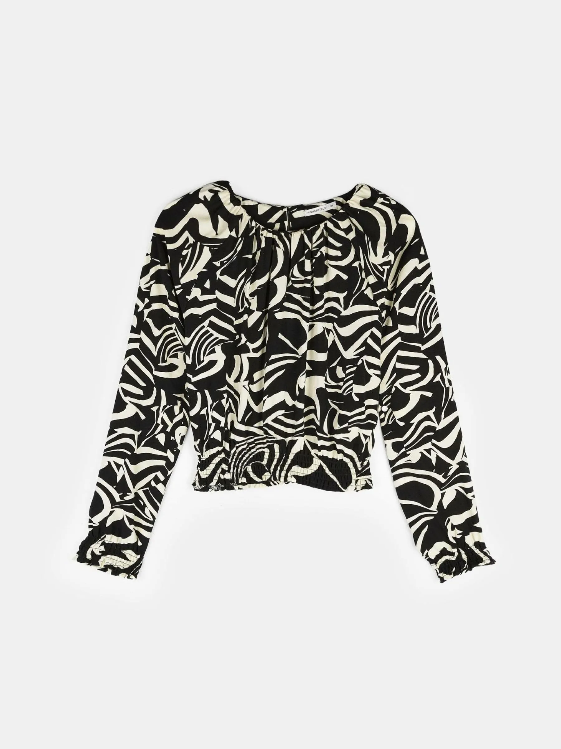 Kolor: czarnyKrój: z marszczeniemTyp: bluzka, topRekaw: długi rękawDługość: krótkiPattern style: wzorzysteDetal: …