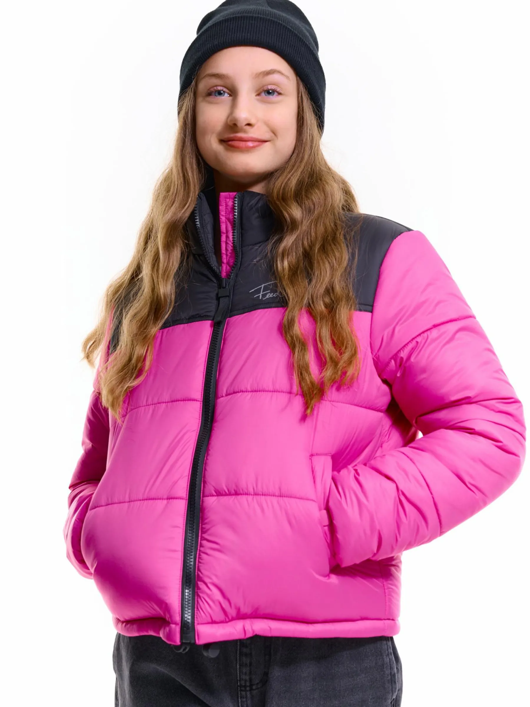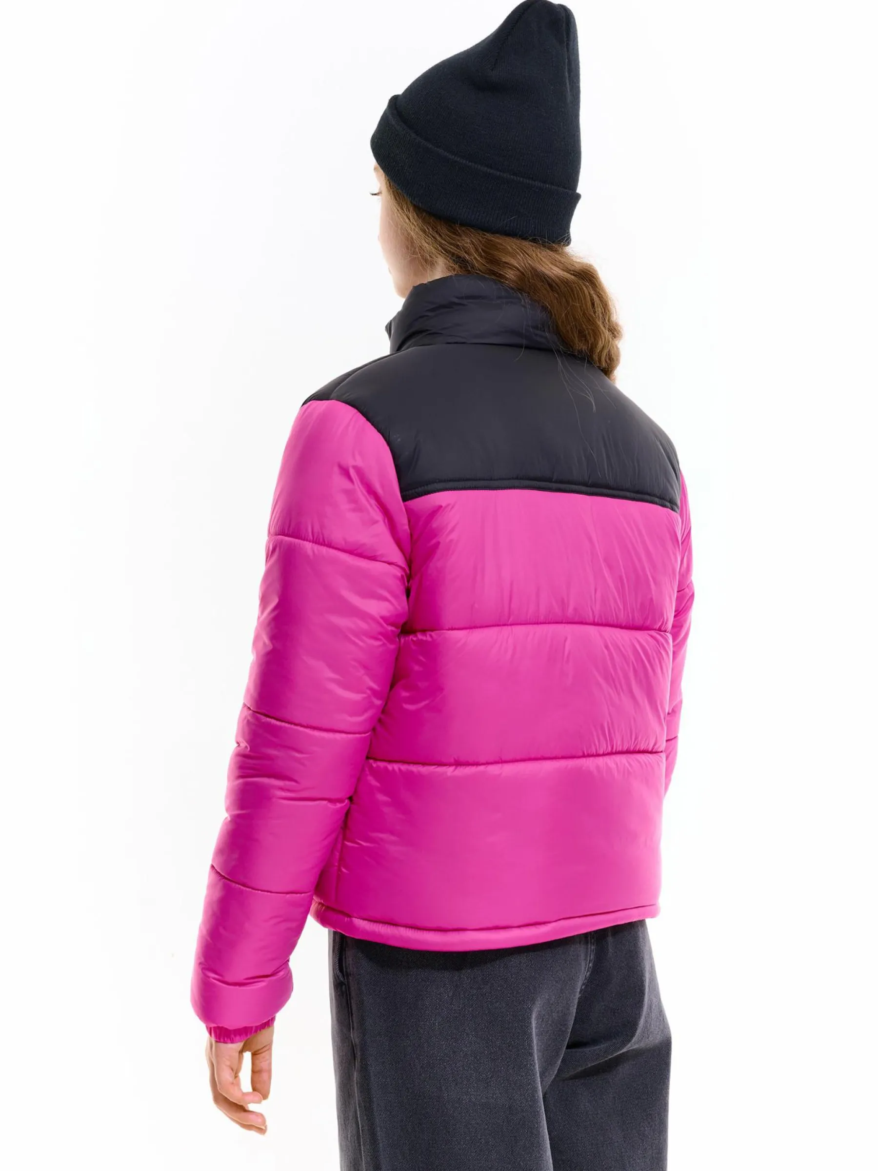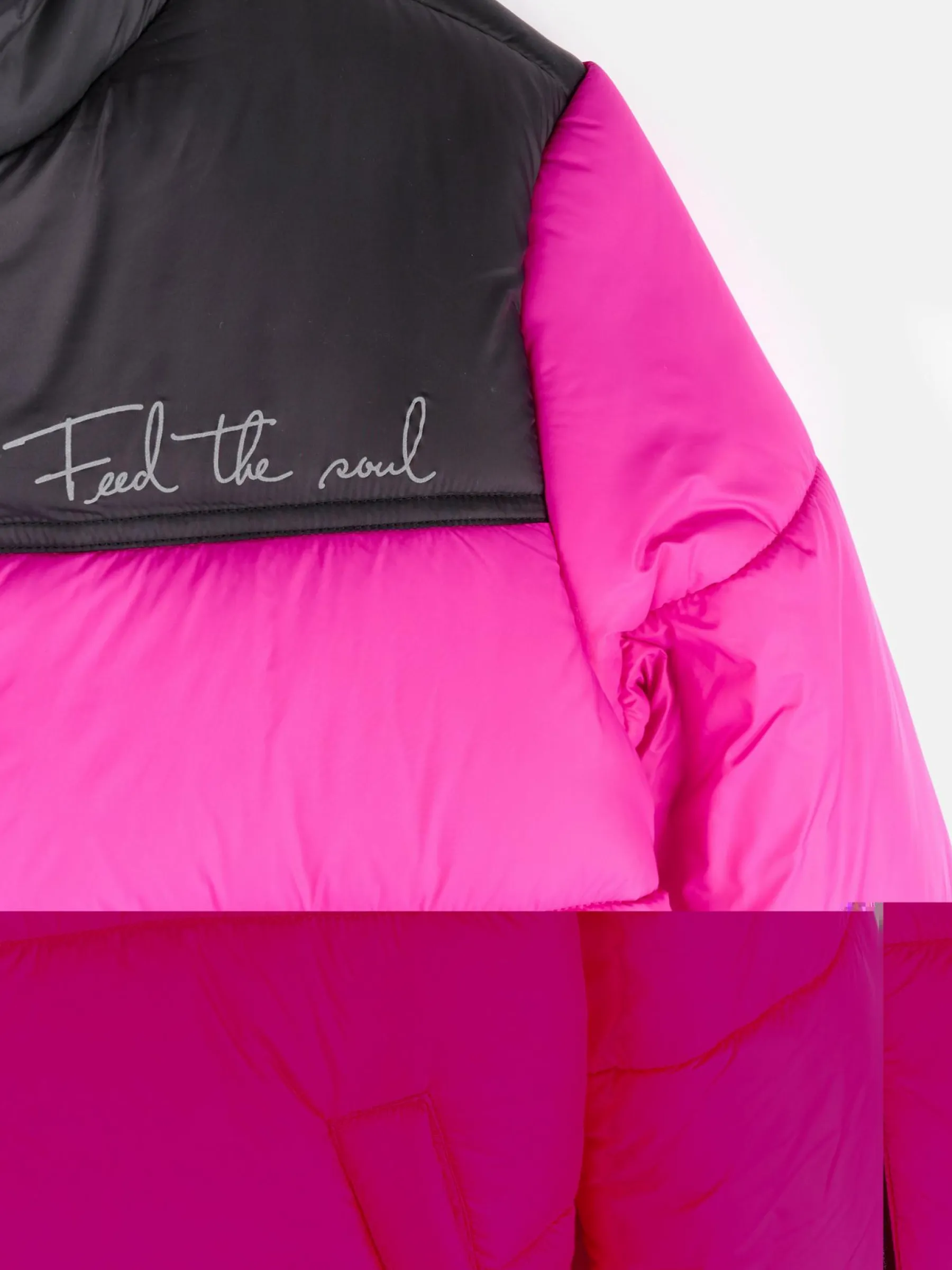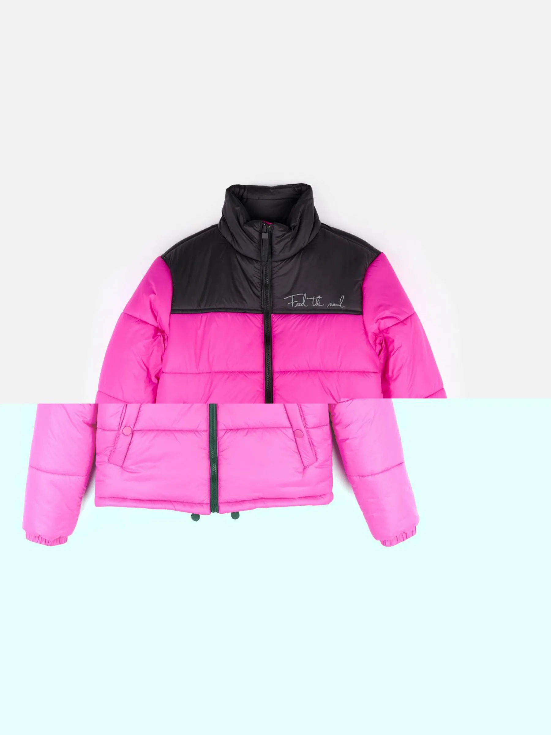 Kolor: różowyKrój: podstawowyTyp: kurtka zimowaRekaw: długi rękawDługość: krótkiPattern style: colour blockDeta…